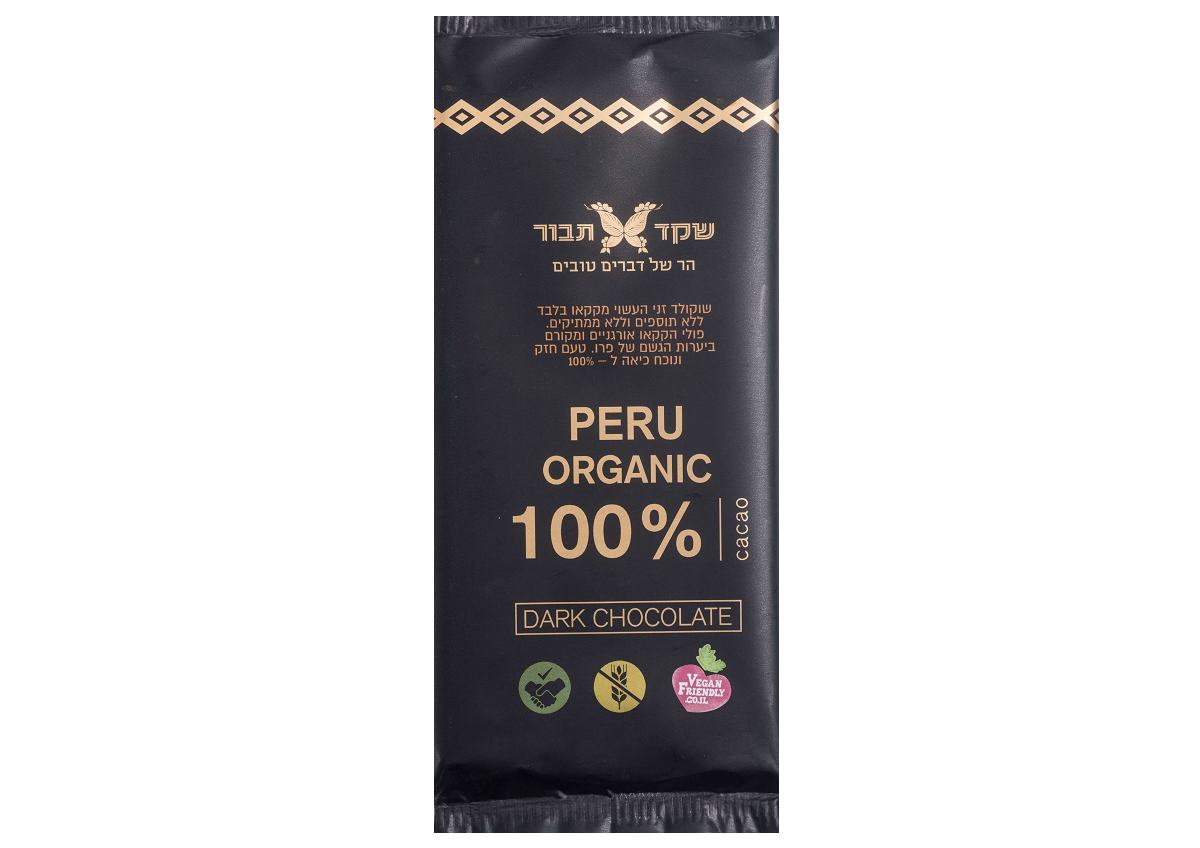שוקולד מריר 100% מסדרת השוקולדים של שקד תבור, מיוצר מפולי קקאו מיערות הגשם בפרו, בעל טעם ארומטי ופירותי ומכיל סוכר קנים אורגני בלתי מזוכך.